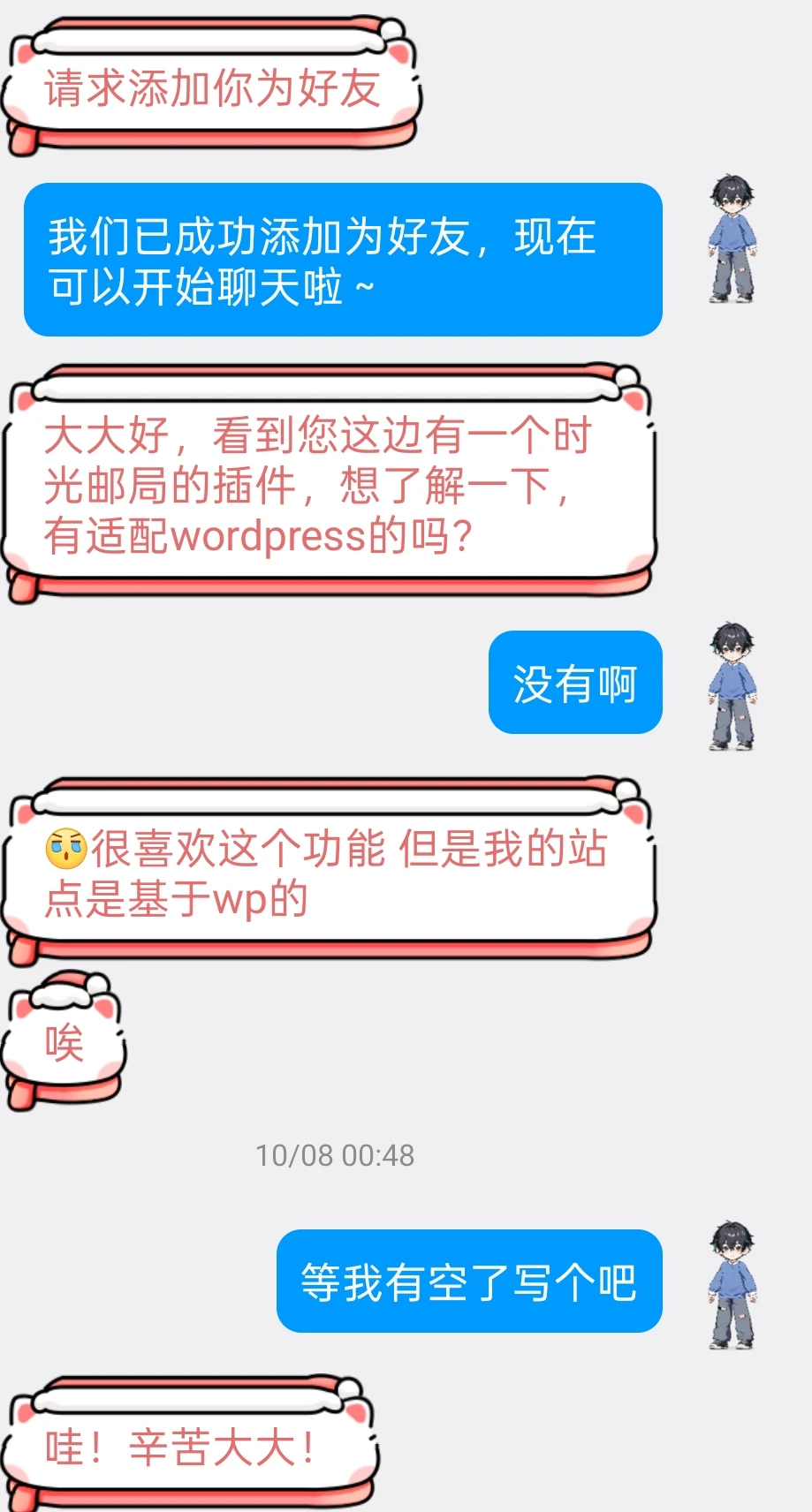 起因:之前在 Emlog 写了一个时光邮局插件,后面一个妹子加我问有没有 WordPress 的。